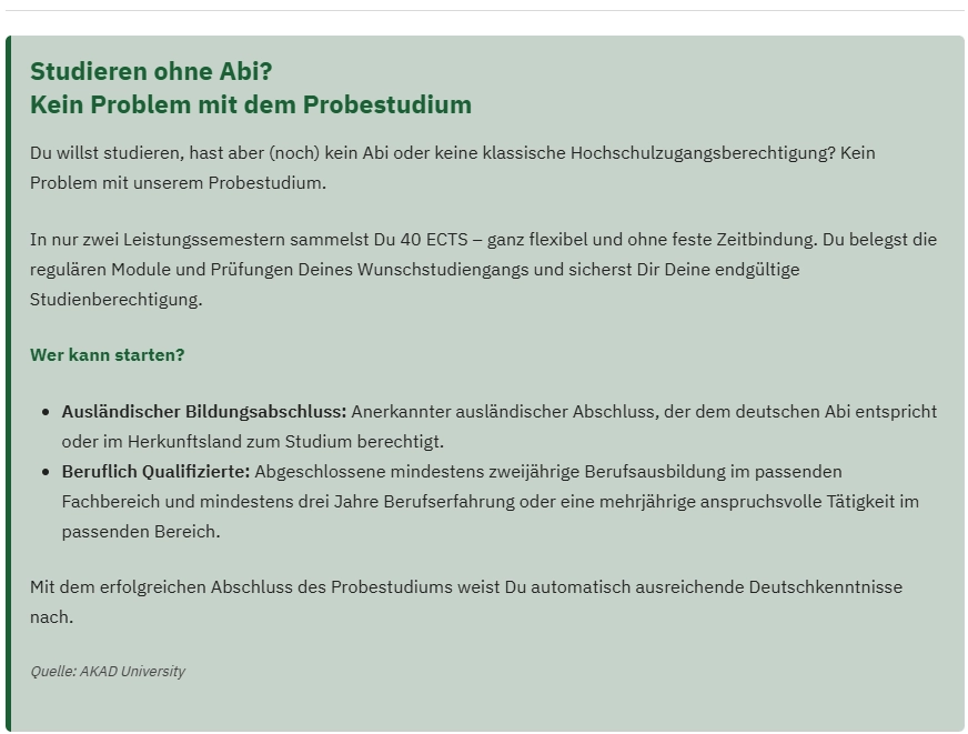 Die AKAD University gehört als erste staatlich anerkannte private Fernhochschule Deutschlands zu den größten Bildungsanbietenden im Fernstudium. Sie bietet mehr als 65 Bologna-Fernstudiengänge mit den Abschlüssen Bachelor, Master und MBA in den Bereichen Wirtschaft & Management, Technik & Informatik, Kommunikation & Kultur sowie Gesundheit & Soziales an. Darüber hinaus bietet sie Hochschulzertifikate und Vorbereitungskurse auf staatliche Prüfungen an. Das digitale AKAD-Fernstudienmodell ist speziell auf Berufstätige ausgerichtet. Beim Pionier im digitalen Fernstudium kommen Berufstätige flexibel, individuell und effizient zum Abschluss – der Studienbeginn ist jederzeit möglich. Mit über 65 Jahren Erfahrung und über 72.000 erfolgreichen Absolventen ist die AKAD University der ausgewiesene Spezialist für das nebenberufliche digitale Fernstudium.